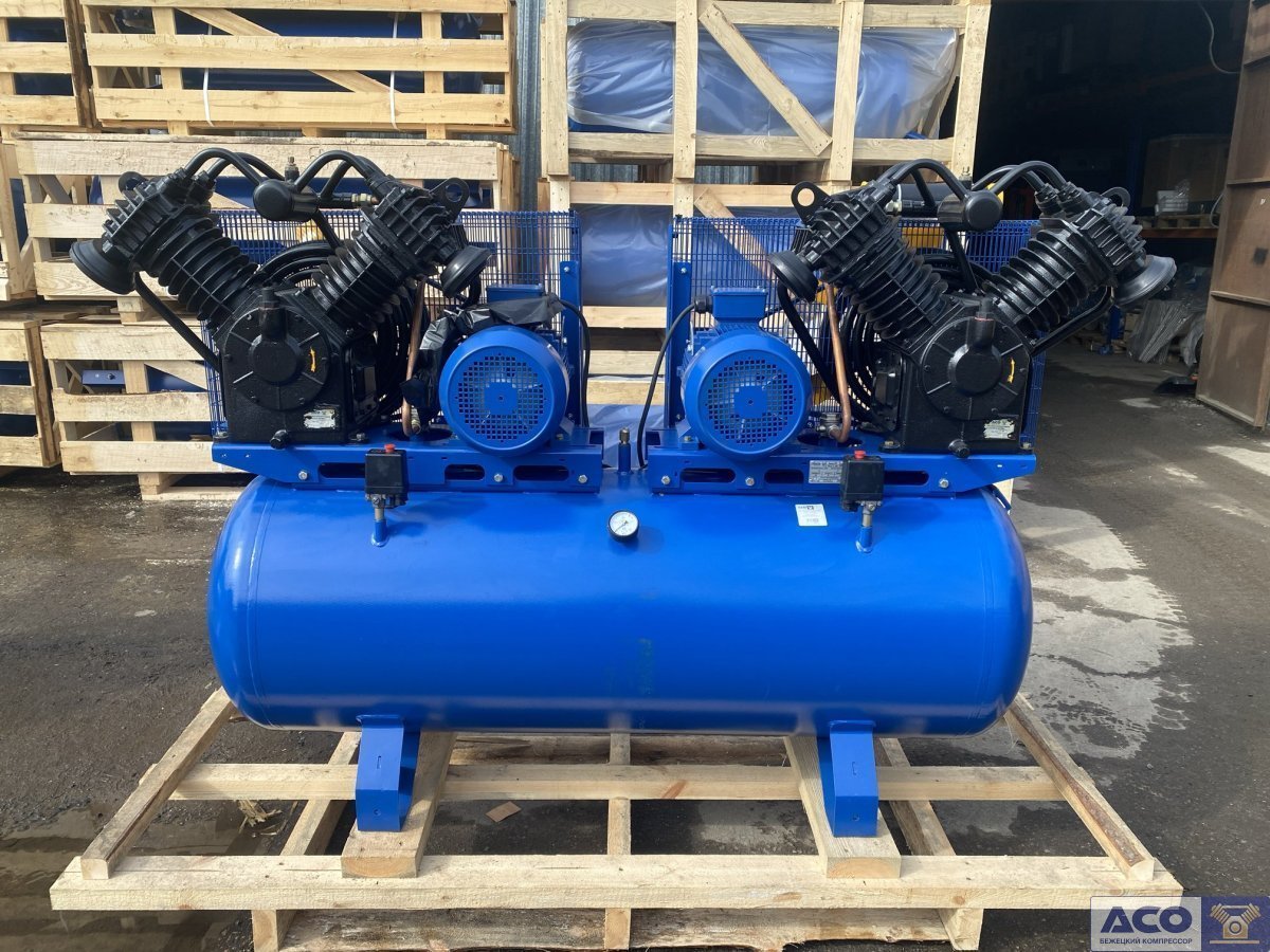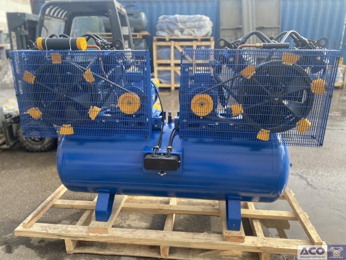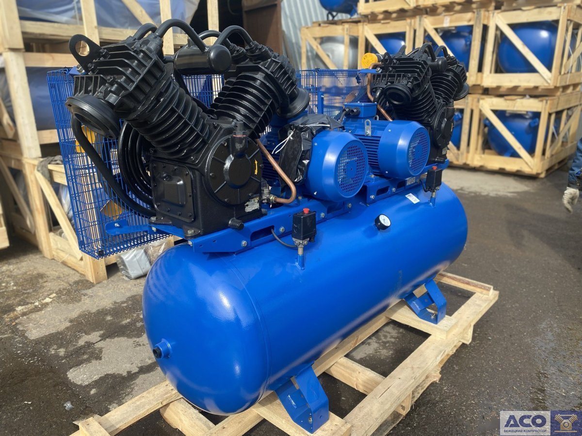Поршневой компрессор с ременным приводом К3/10 с давлением 10 бар – это уникальная компрессорная установка типа «тандем» Бежецкого завода “АСО”. Две компрессорные головки С416М (C416М.01.00.000-09 и C416М.01.00.000-09зч) установлены на горизонтальный окрашенный ресивер объемом 500 л. Сжатие воздуха реализовано двумя парами цилиндров высокого и низкого давления. Расположение цилиндров: V-образное.