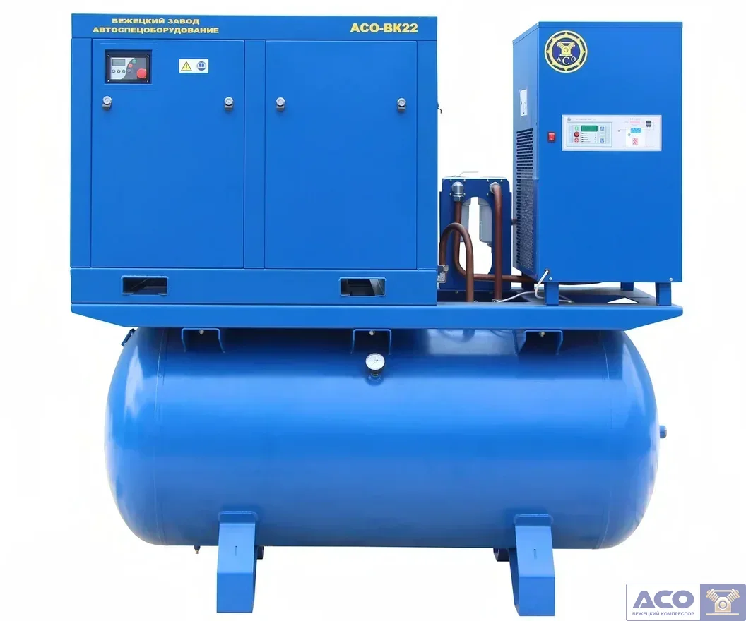 Винтовой компрессор АСО-ВК22М2ОВ/10-900 с воздушным охлаждением - линейка винтовых компрессоров Бежецкого АСО российского производства на базе китайских винтовых блоков BAOSI YNT70B для производства сжатого воздуха, осушенного и очищенного от технических примесей: